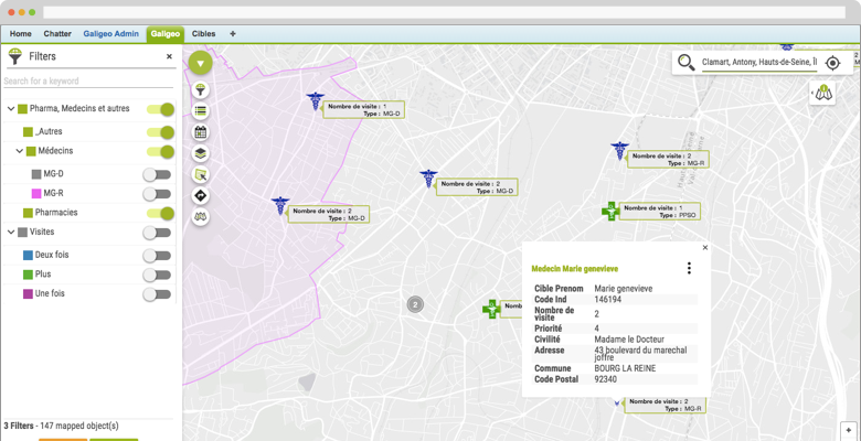 Depuis la carte, vos équipes commerciales disposent de plusieurs types de filtres pour cibler les clients et prospects en fonction des priorités du moment. En savoir +
